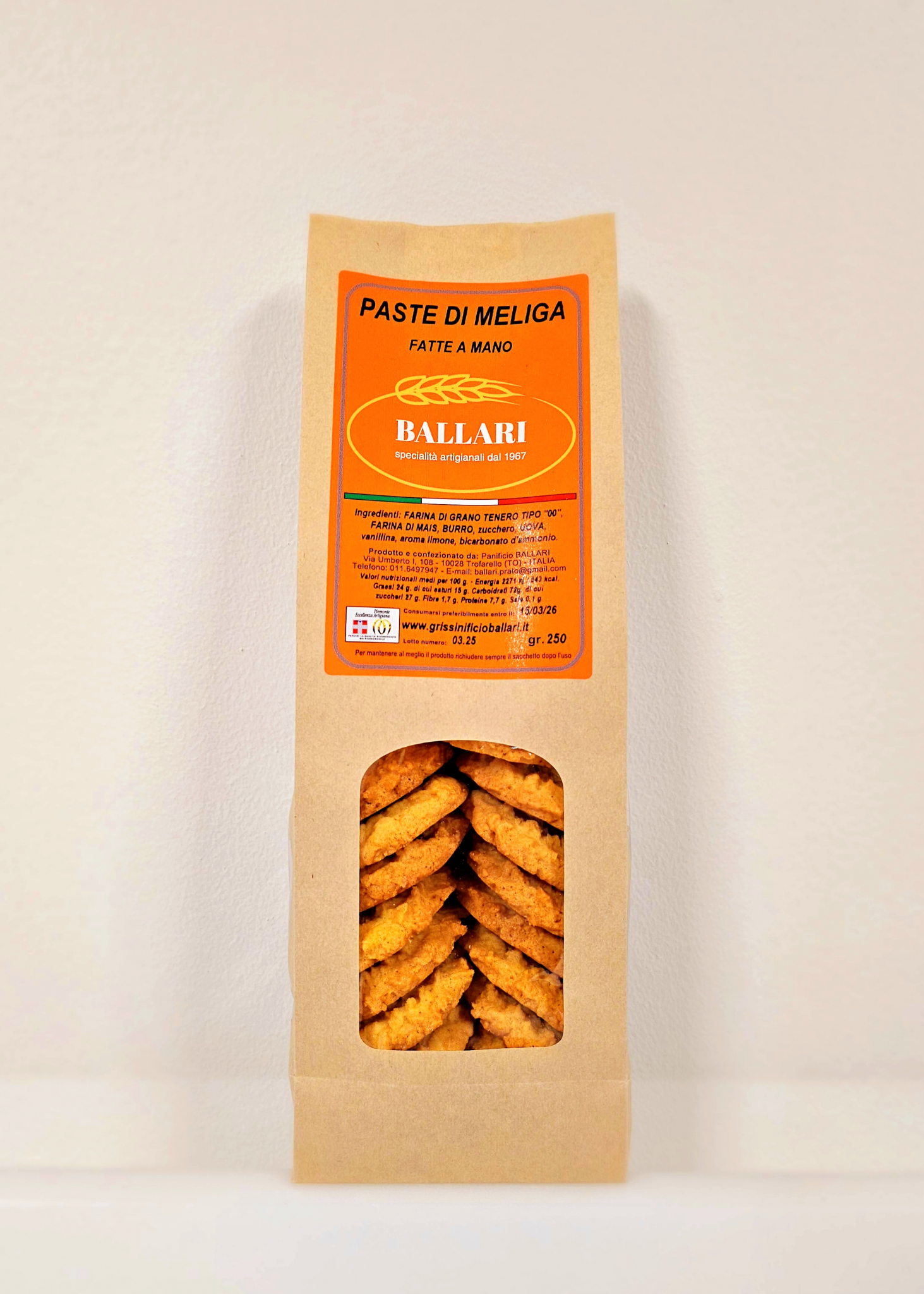 I biscotti leggeri, friabili e gustosi, caratterizzati da un mix perfetto di farina di mais e farina di grano tenero, da gustare in compagnia di un buon caffè. Ingredienti: Farina di mais, farina di grano tenero tipo "00", burro, uova, zucchero, vanillina, limone, bicarbonato d'ammonio. Peso: 250 g. -