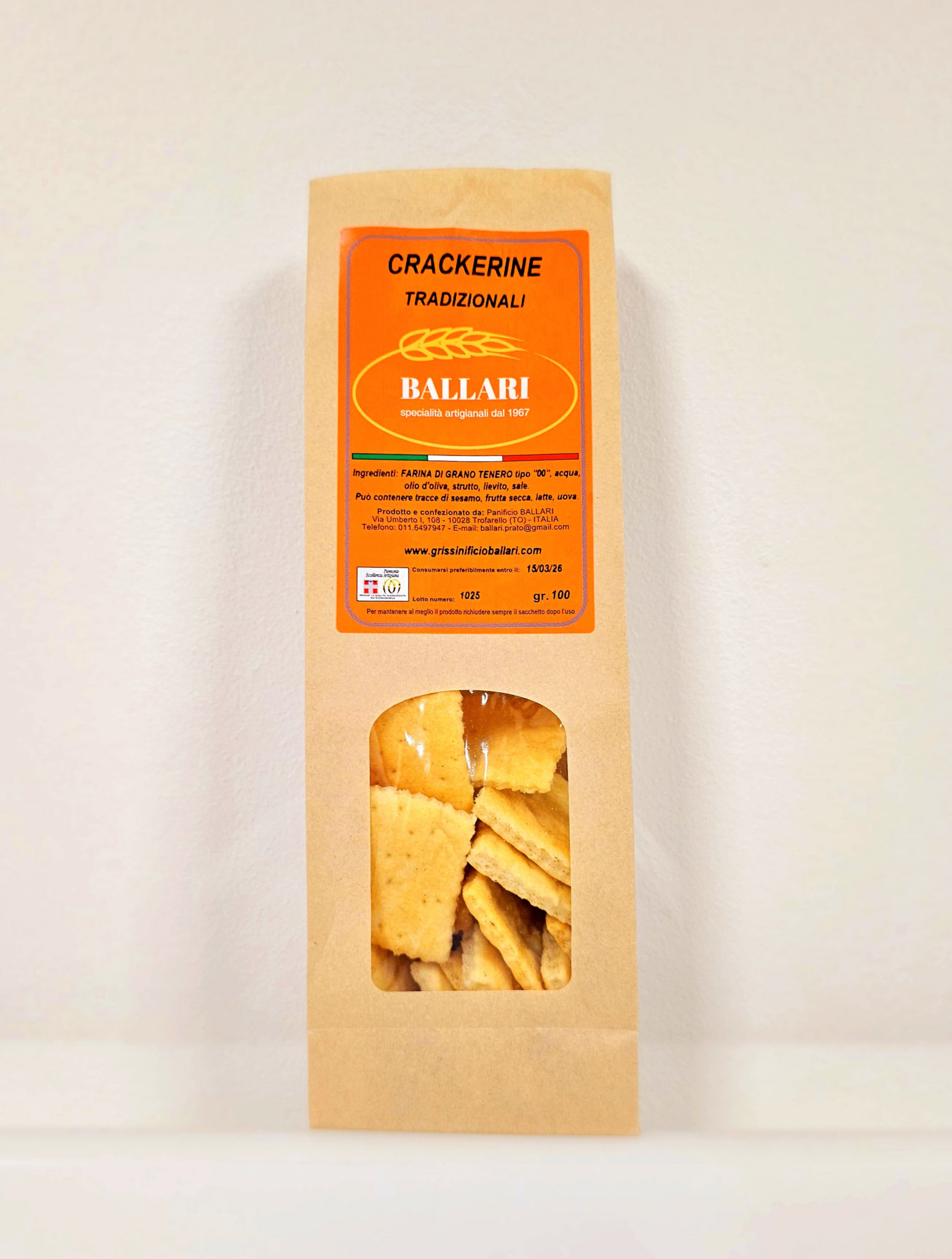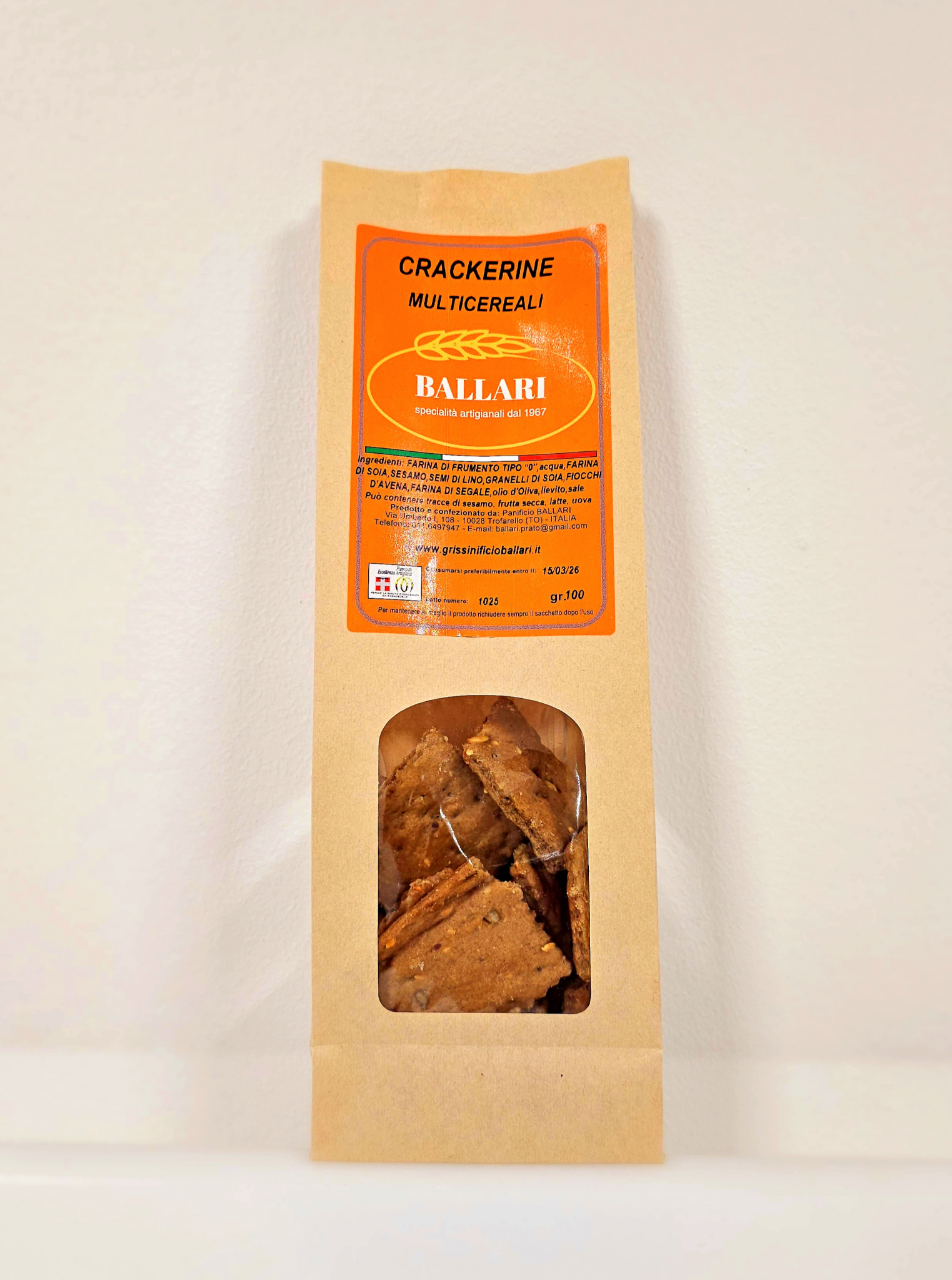Sono la nostra variante sfiziosa ma salutare ai classici crackers. Il nostro mix di farine conferisce al crackers un sapore unico e deciso. Perfetti per aperitivi, spuntini, per fare la base di un tortino o da accompagnamento per i pasti principali. Ingredienti: Farina di grano tener di tipo "00",semi di sesamo, semi di girasole, farina di segale, semi di lino, farina d'orzo, farina d'avena, olio d'oliva, sale, malto d'orzo, lievito. Peso: 200 g/cad.