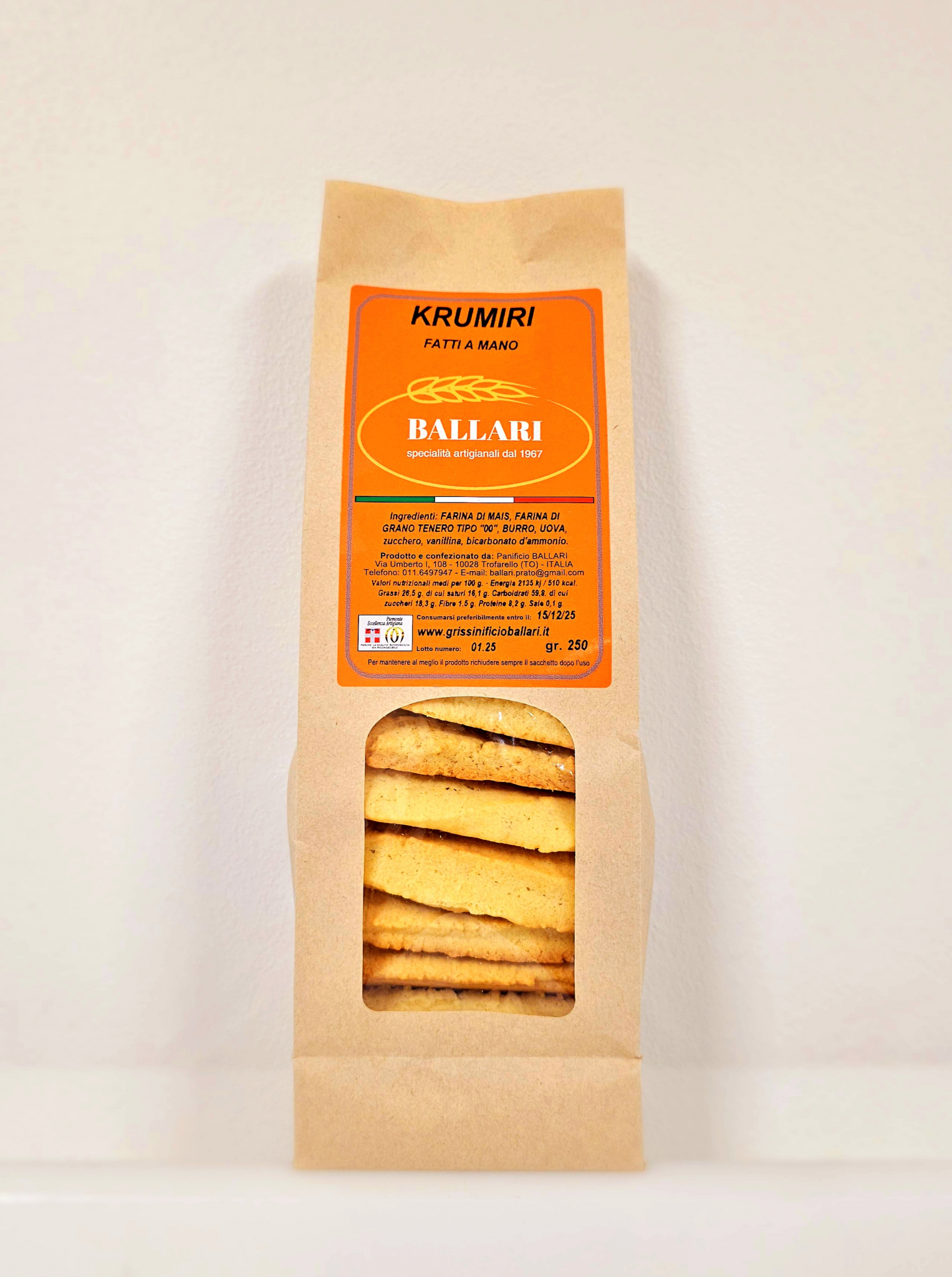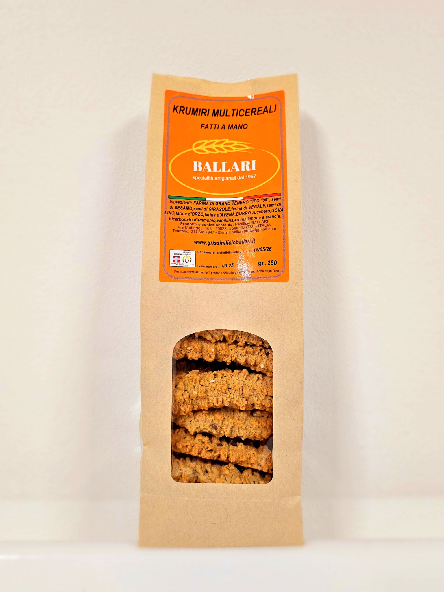 E’ la variante salutare al Krumiri classico. Il nostro mix di farine speciali lo rende unico e molto saporito. Ideale per chi vuole concedersi uno sfizio senza rimorsi. Ingredienti: Farina di grano tenero di tipo "00",semi di sesamo, semi di girasole, farina di segale, semi di lino, farina d'orzo, farina d'avena, burro, uova, vaniglia, limone, bicarbonato d'ammonio. Peso: 250 g. -