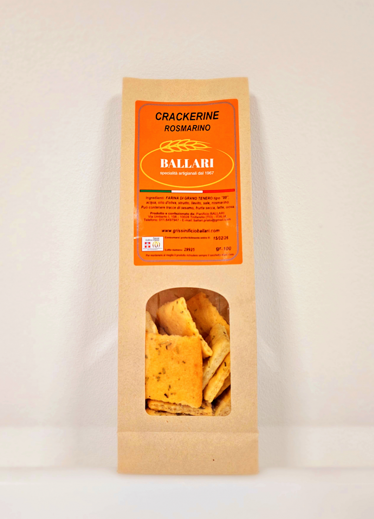 Sono la nostra variante sfiziosa ai classici crackers. Perfetti per aperitivi, spuntini, per fare la base di un tortino o da accompagnamento per i pasti principali. Ingredienti: Farina di grano tenero tipo "00",acqua, olio extra vergine d'oliva, strutto, lievito, sale, rosmarino (o senza rosmarino). Peso: 200 g. -