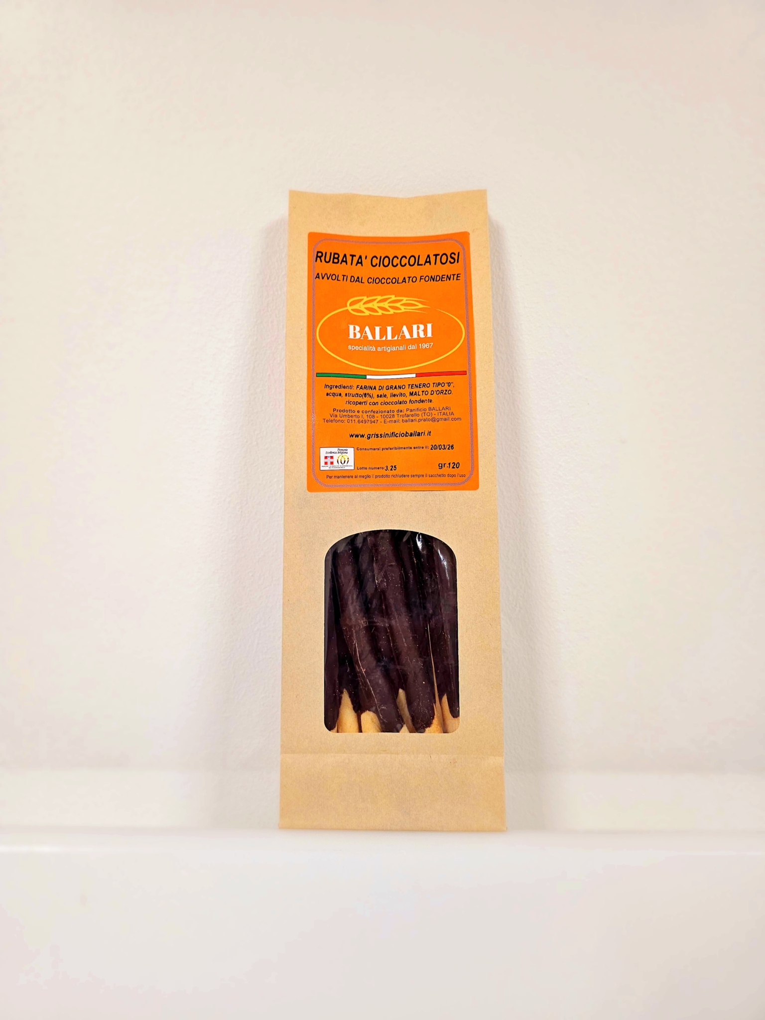 Ingredienti: Farina di frumento “0”, acqua, strutto, sale, lievito, malto d’orzo. ricoperti con ciocccolato fondente.