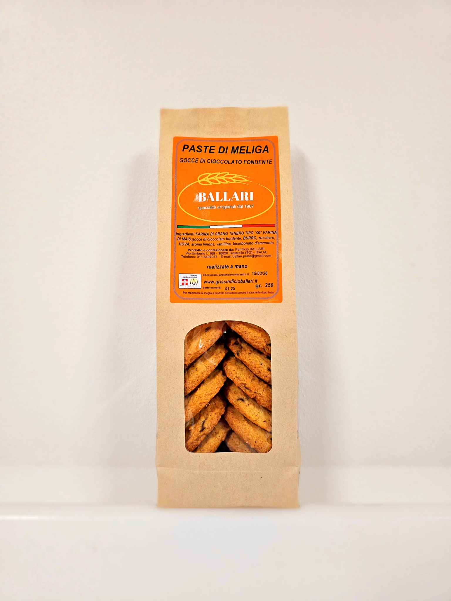 Delicate e friabili, le nostre paste di meliga artigianali nascono da una ricetta tradizionale che esalta il gusto autentico della farina di mais. Il loro profumo avvolgente e la consistenza che si scioglie in bocca incontrano l’intensità delle gocce di cioccolato fondente, creando un equilibrio perfetto tra dolcezza e carattere.