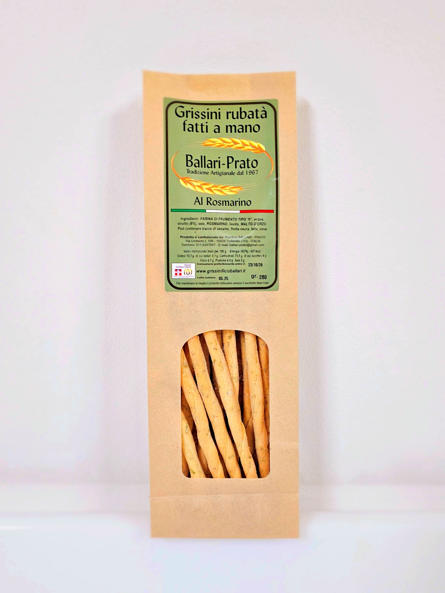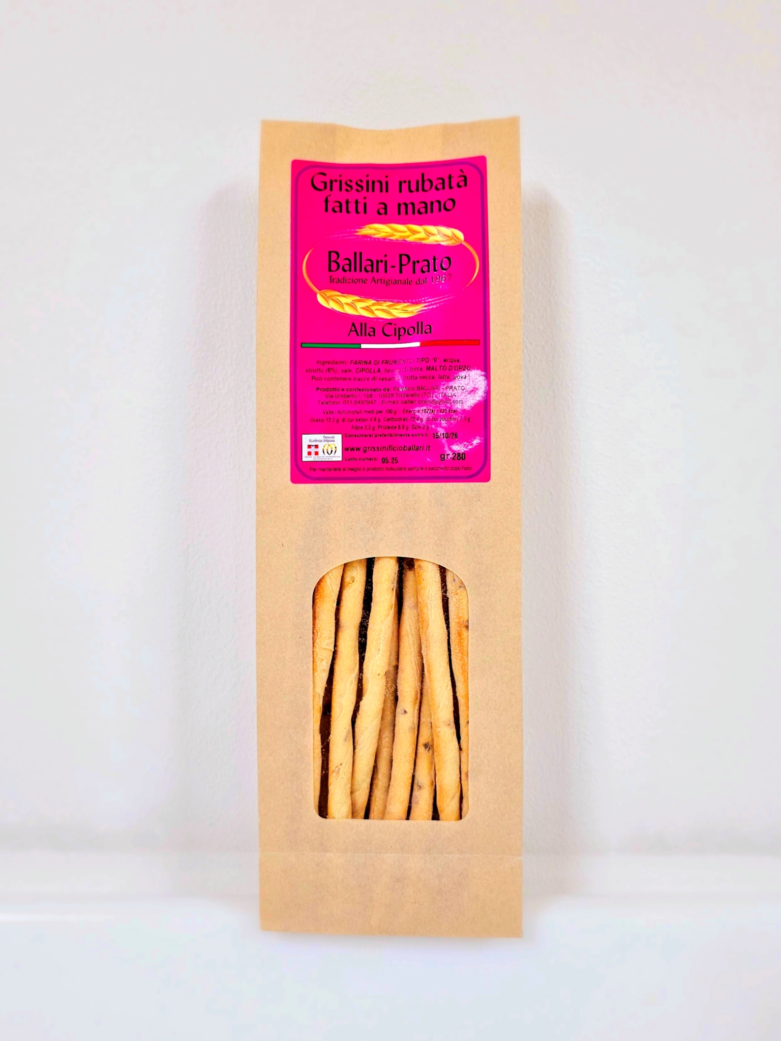 Ingredienti: Farina di frumento tipo “0”, acqua, latte, acciughe, olio extra vergine d'oliva, strutto, aglio, sale, lievito, malto d'orzo. Peso: 240 g.